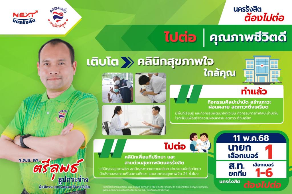 ผลักดันให้มีนักจิตวิทยา นักสังคมสงเคราะห์ในสถานศึกษา เพื่อเป็นเพื่อนที่รู้ใจ และสายด่วนสุขภาพจิต เพื่อชาวนครรังสิต 24 ชั่วโมง